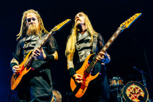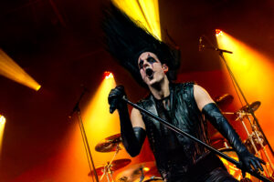 For Bloody Angel, the theatrics escalated further. Eckerström returned wearing a red circus ringmaster coat, wielding a staff like a puppet master. The clown had become the conductor of chaos. The song itself mirrored that contrast: a melodic opening colliding with soul-crushing roars.