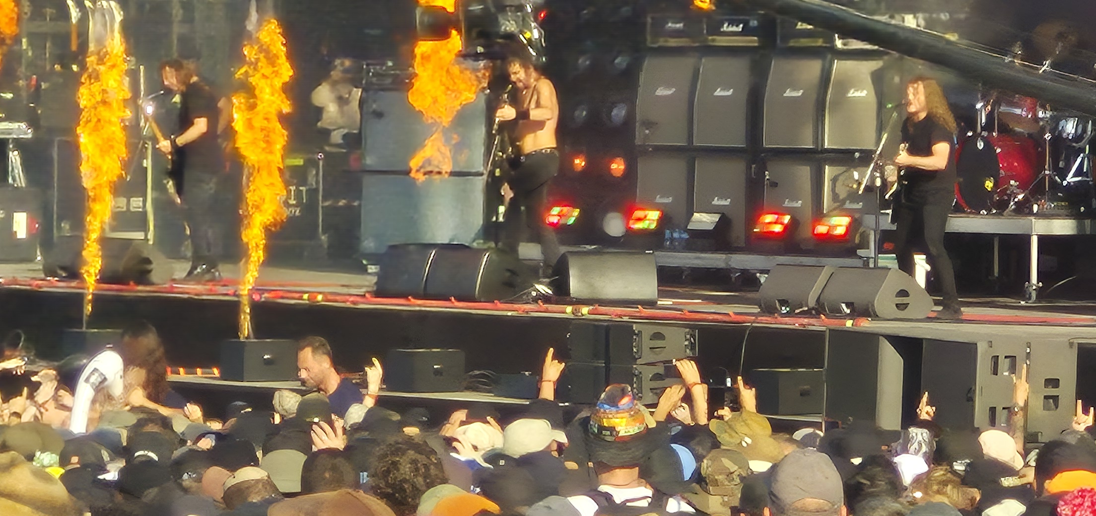 to hit the stage. It is a stage that Airbourne know very well as this is the band’s sixth appearance since the Aussie rockers first came to Hellfest in 2008. Airbourne really are the perfect band for Hellfest, right from set opener Ready To Rock, through crackers like Too Much , Too Young, Too Fast or newer tracks like Gutsy in a similar way to their fellow Aussie rockers, AC/DC…You know what you are going to get, heads down raw rock n roll and this Hellfest crowd laps up every minute! With Runnin’ Wild the band leave the stage but the great news is…Airbourne will be back rocking the concert halls of the UK in early 2026!