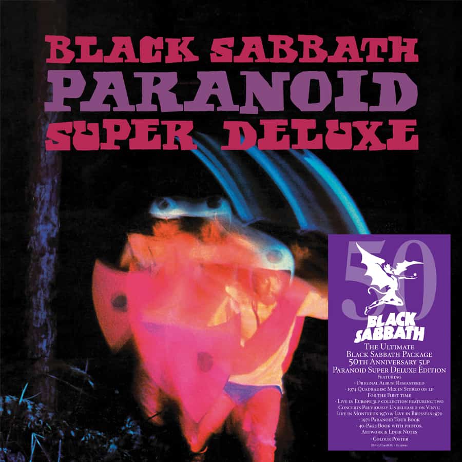 PARANOID: SUPER DELUXE EDITION includes the original album, in addition to a rare 1974 Quad Mix of the album folded down to stereo, plus two concerts from 1970, from Montreux and Brussels, that are pressed on vinyl for the first time. The five-LP set comes with a hardbound book with extensive liner notes featuring interviews with all four band members, rare photos, and memorabilia, a poster, as well as a replica of the tour book sold during the Paranoid tour.