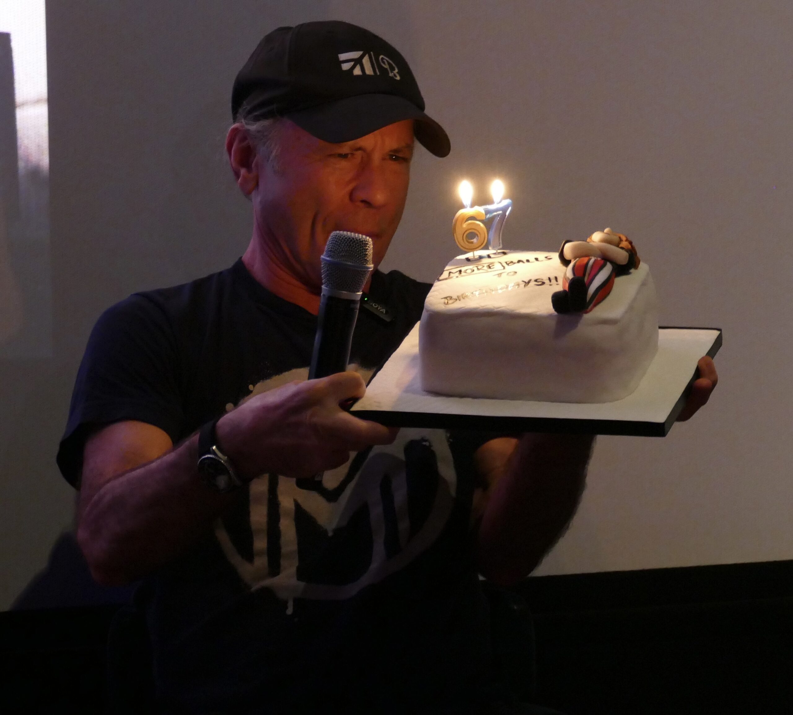 The event ended with Bruce receiving a very cool cake with the numbers ‘67’ and an icing effigy of himself in stripey red, white and black pants and emblazoned with the slogan “More Balls To Birthdays!”