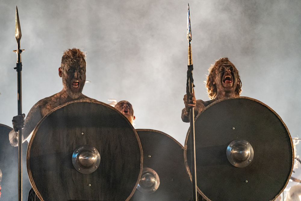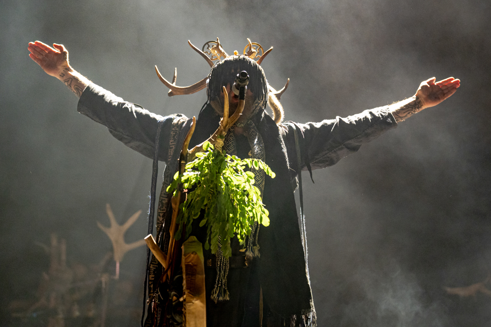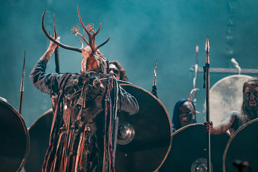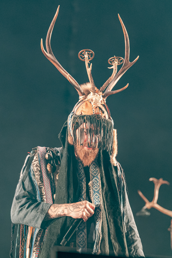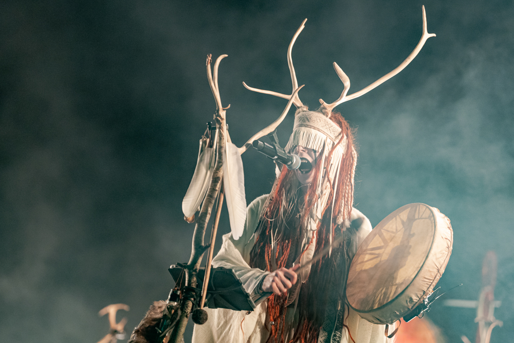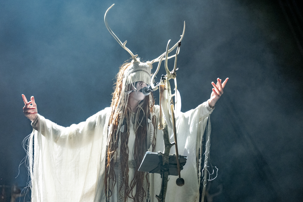 Mystical sounds, folklore and ritual aesthetic. Heilung are an experimental folk music band with members from Norway, Germany and Denmark. They describe their music as “amplified history from early medieval northern Europe” which is based on text and runic inscriptions from Germanic peoples of Bronze, Iron and Viking Age. Around 12 people in fur and other tribal outfits occupied the stage, some mounted with spear and shields.