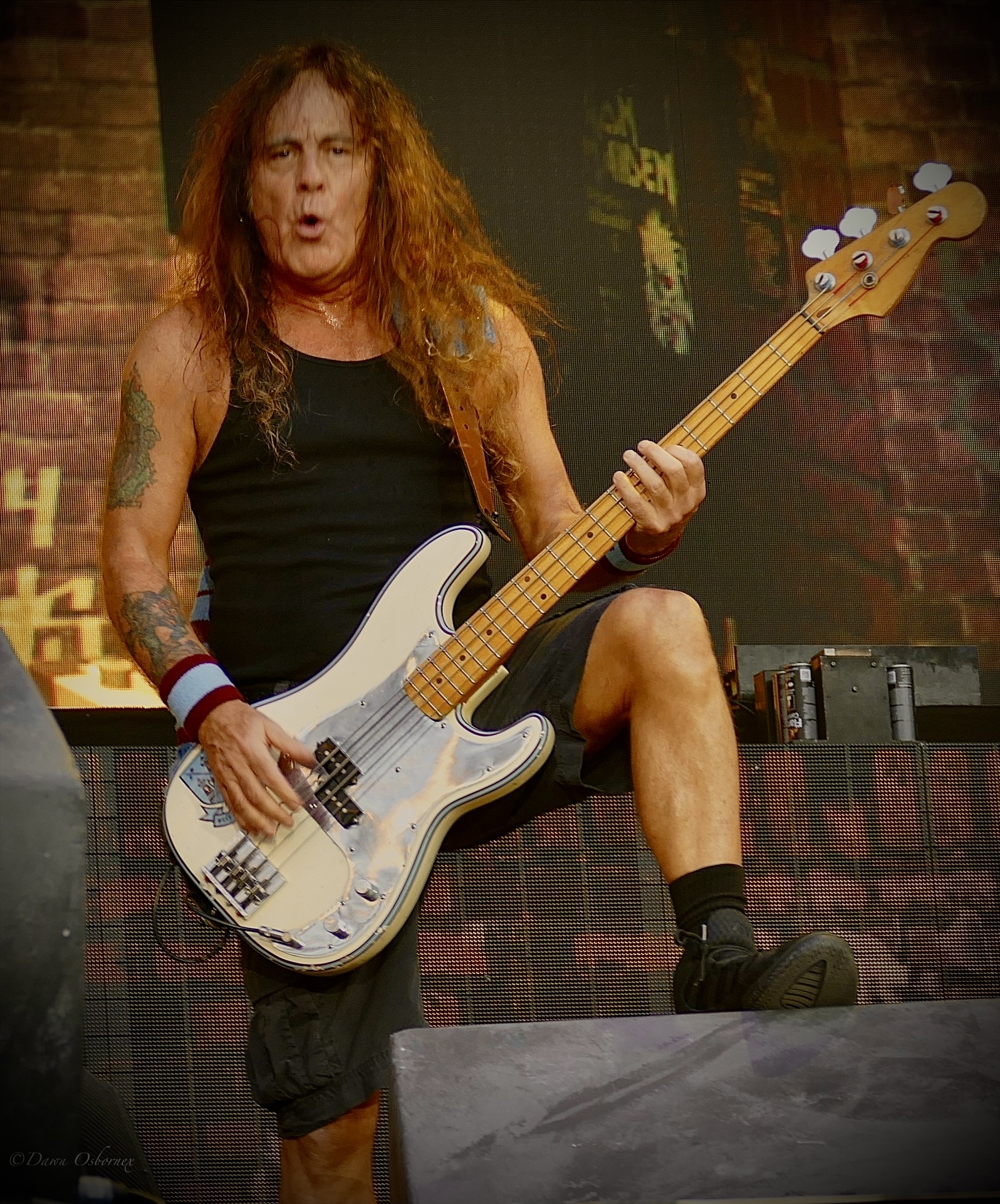 Eddie as a pharaoh sitting in front of a huge pyramid and huge jets of flame signify ‘Powerslave’ as Bruce came on wearing a slightly bizarre mask of bird feathers with plumage rising at least a foot above his head. Dave Murray did a beautiful long melodic solo, while Steve threw his hair forward and back. It’s hot today and I am guessing he is doing that to keep cool rather than simply to look it. Bruce finished with a crossed arm position like royal mummies, paused for dramatic effect.