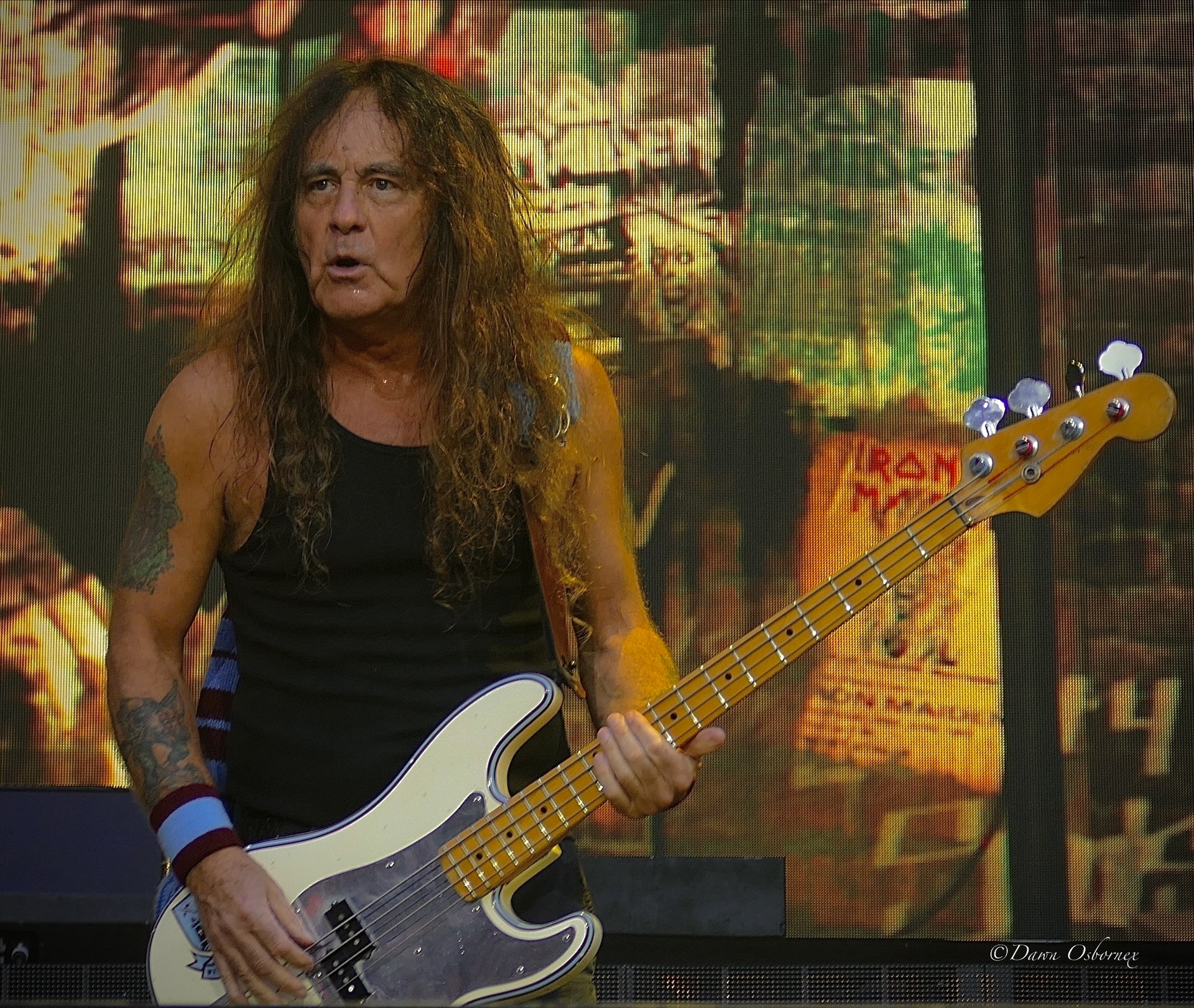 And then the iconic ‘Number Of The Beast’! Bruce’s voice sounds so good! Adrian does a long solo against the backdrop of flames and old black and white horror flicks. Steve Harris runs all over the stage and mount the drum riser to better survey the crowd. Janick Gers did a tailgunner motion with his guitar mock shooting the crowd.
