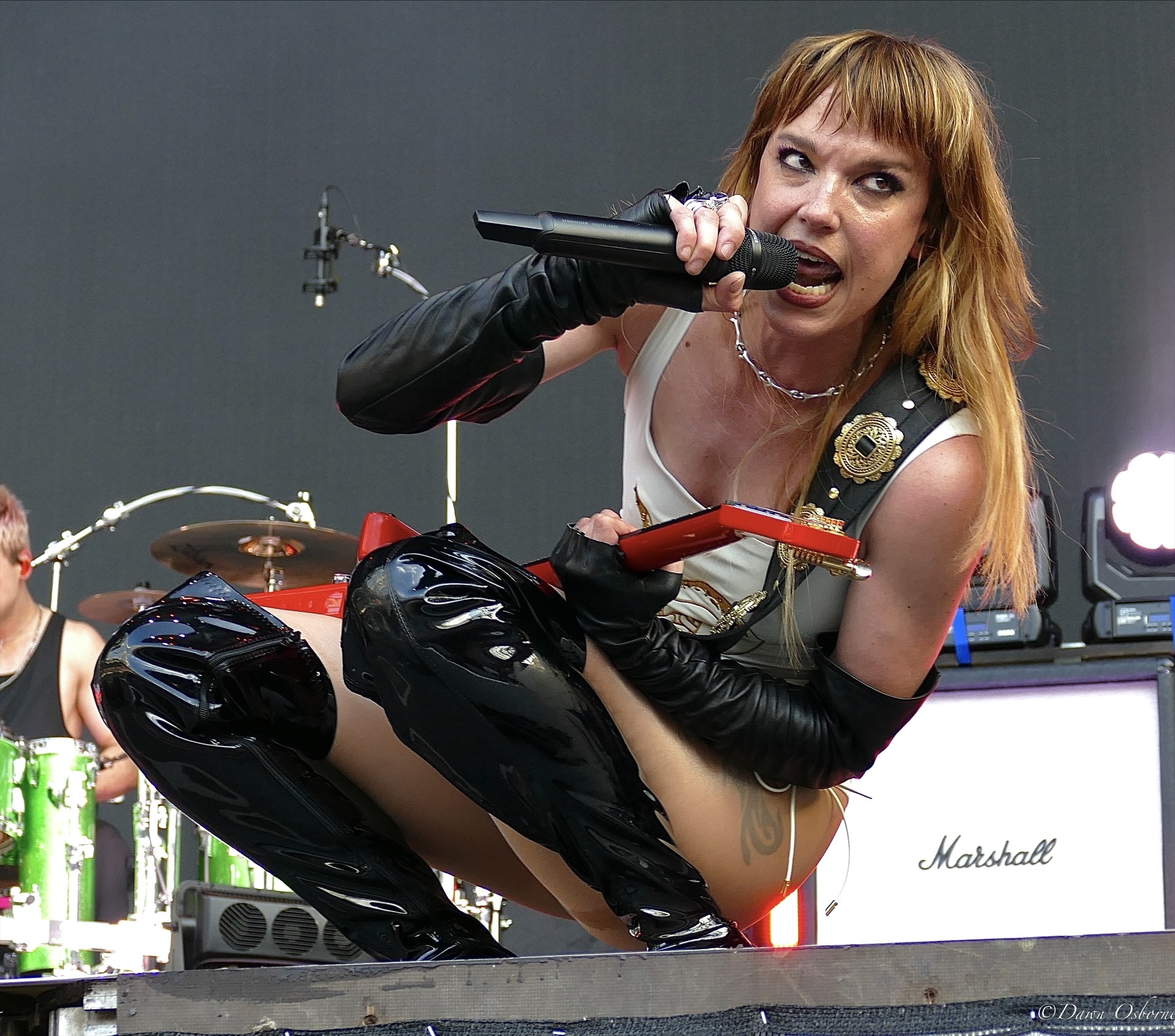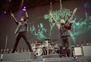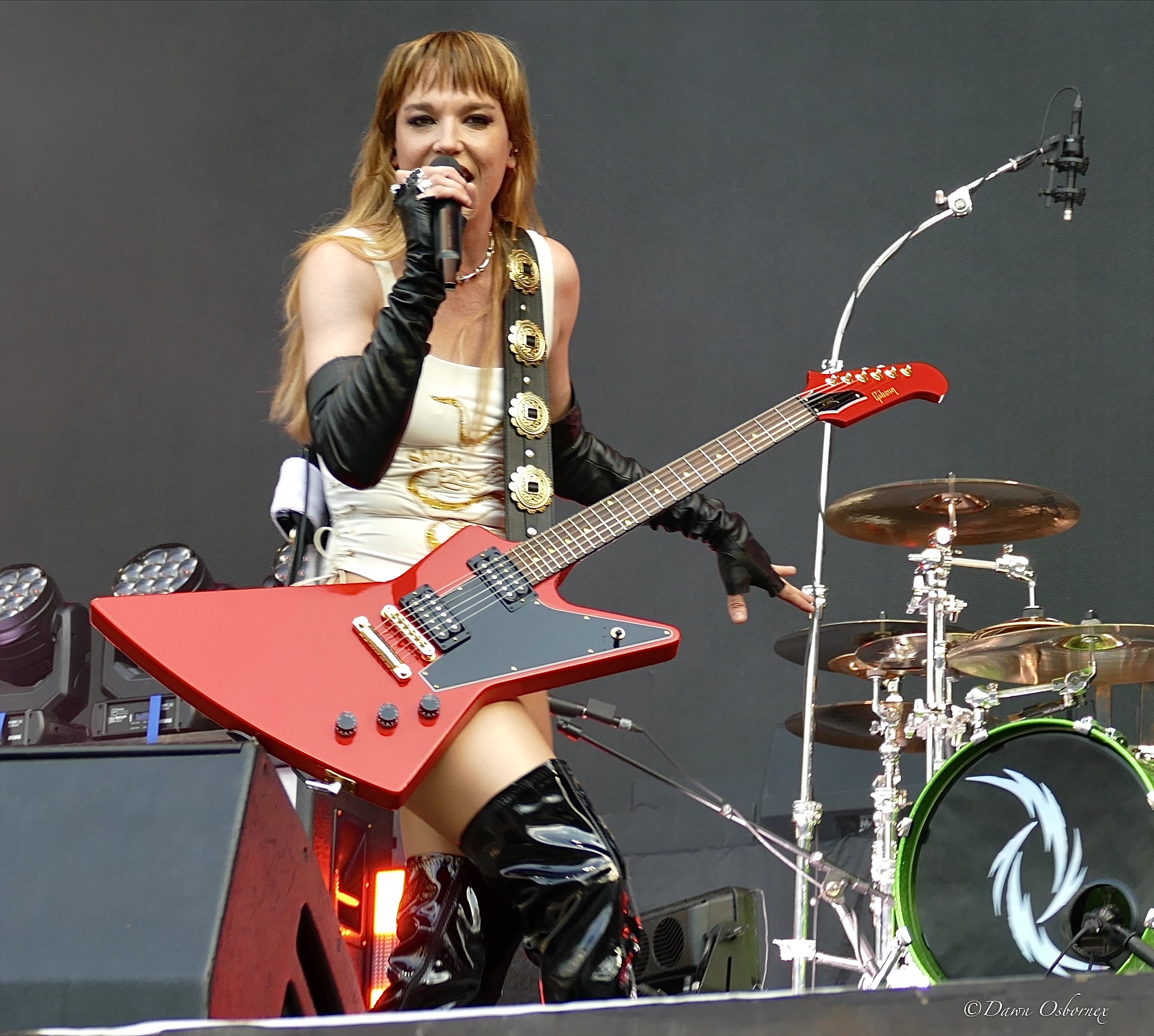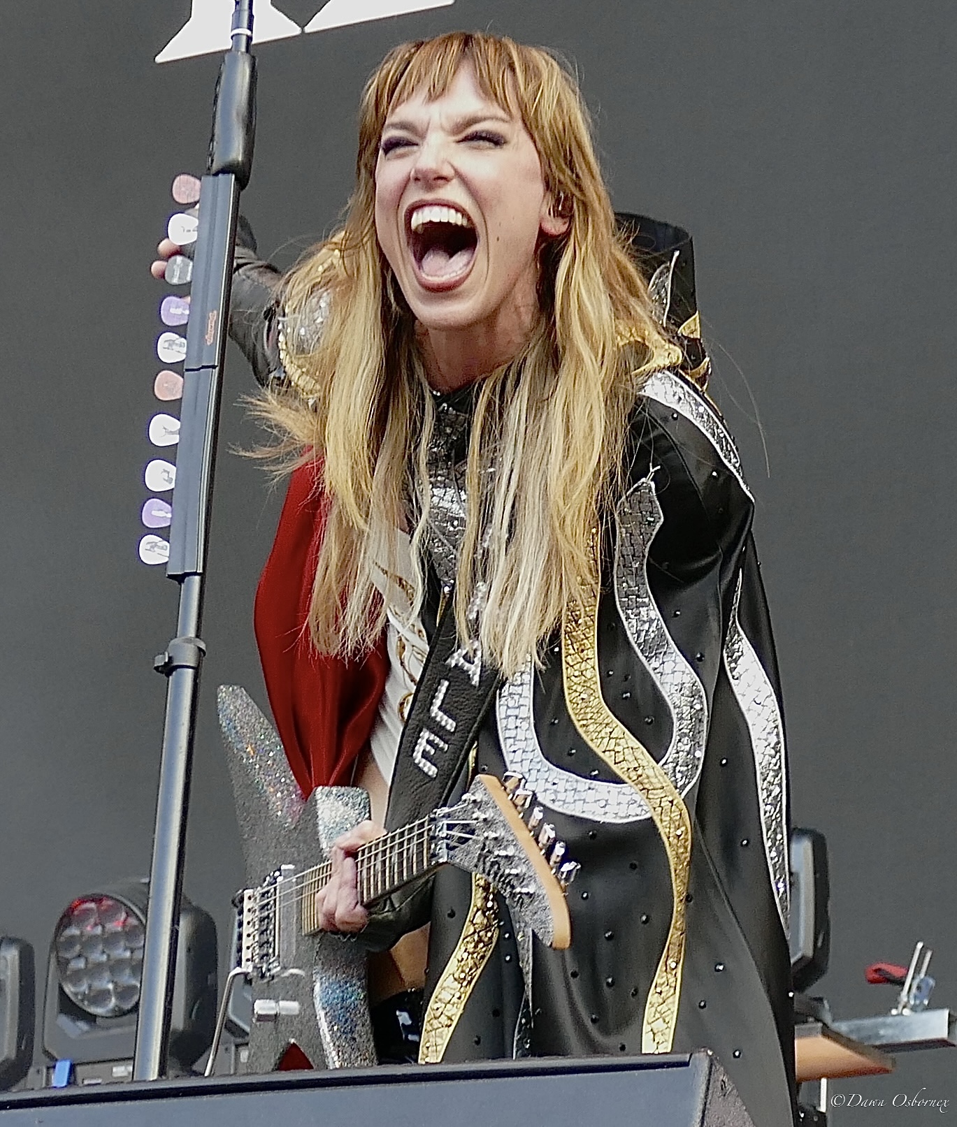 Lzzy Hale came on in a stunning long black cape embellished with cascading gold and silver snakes and a crimson red lining over a cream coloured swimming costume featuring a golden serpent accessorised with shiny pvc thigh length platform boots and long black fingerless gloves as they kicked off with the first track on their new album ‘Fallen Star’. Her voice is in tip top condition blasting out the melody and they easily handle this full stadium of thousands. Arejay’s hard hitting drumming really stands out on every track.
