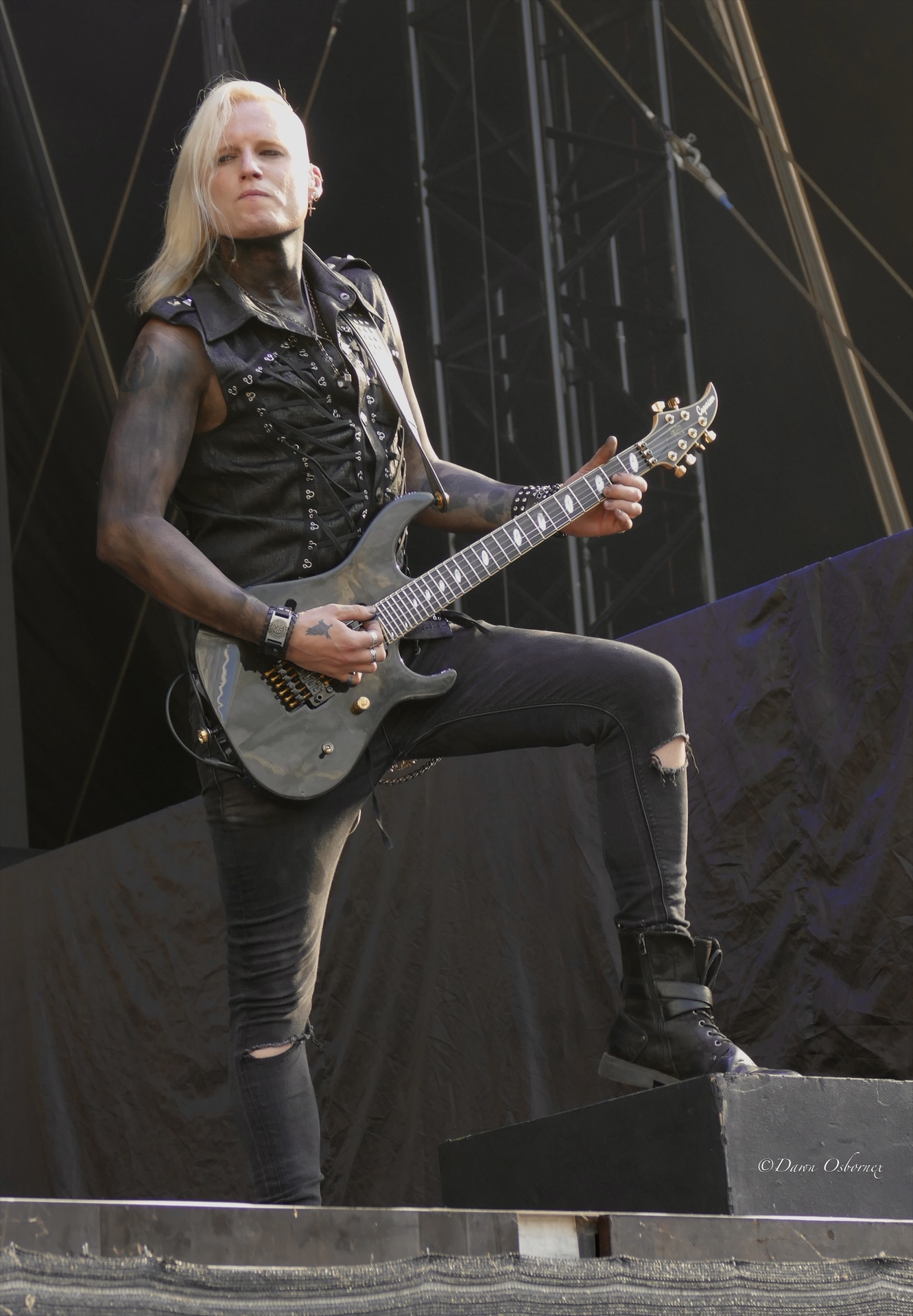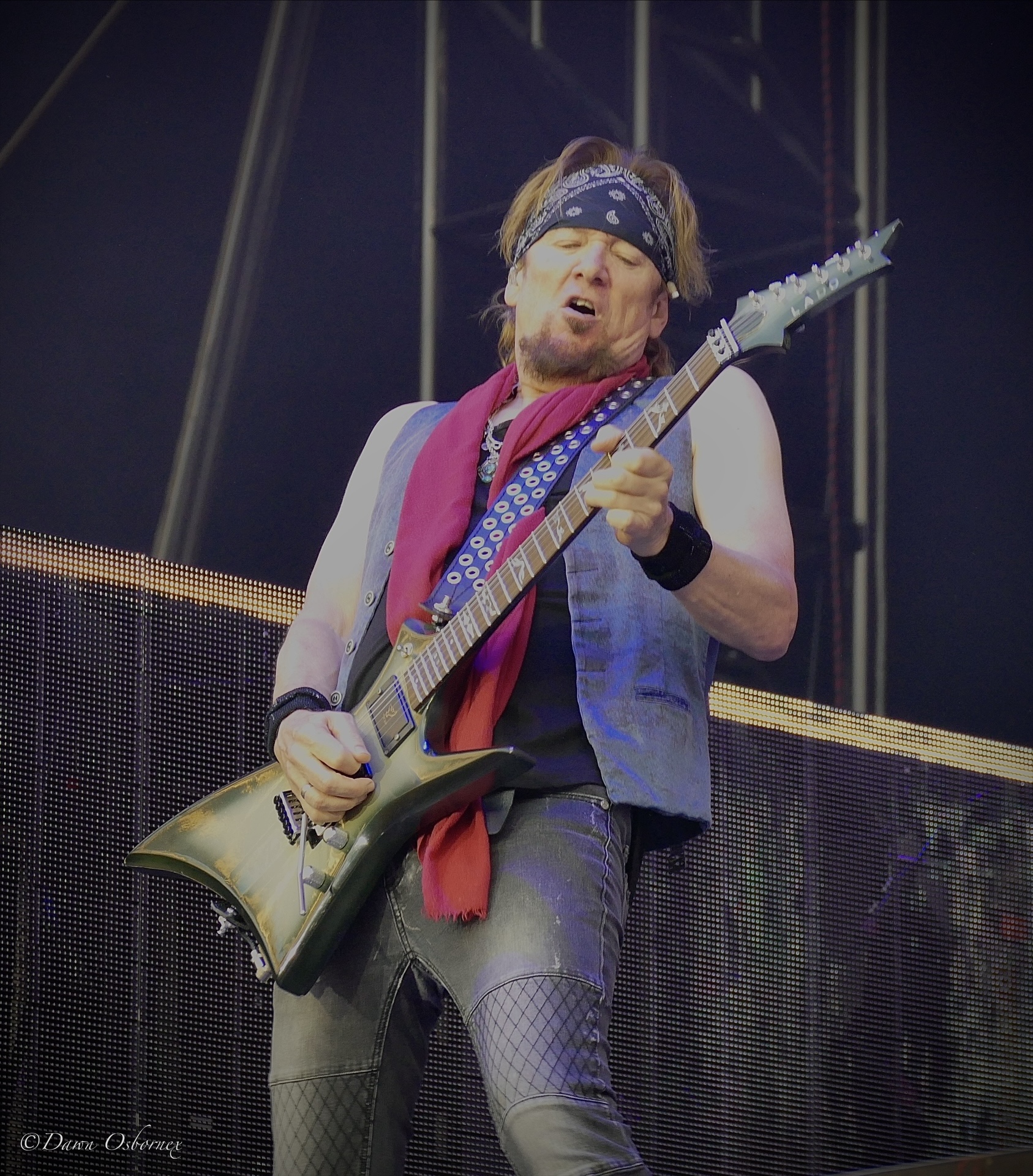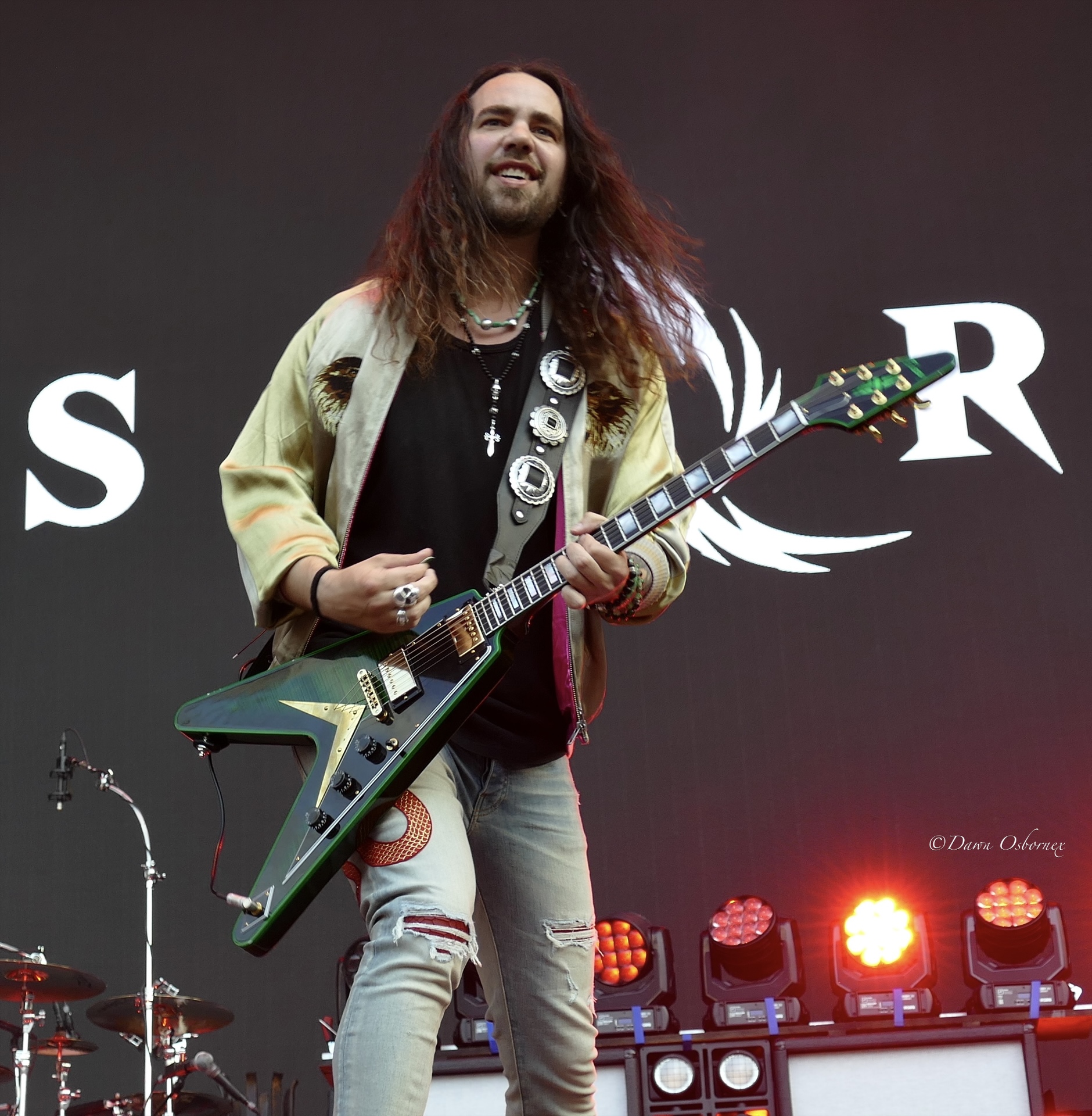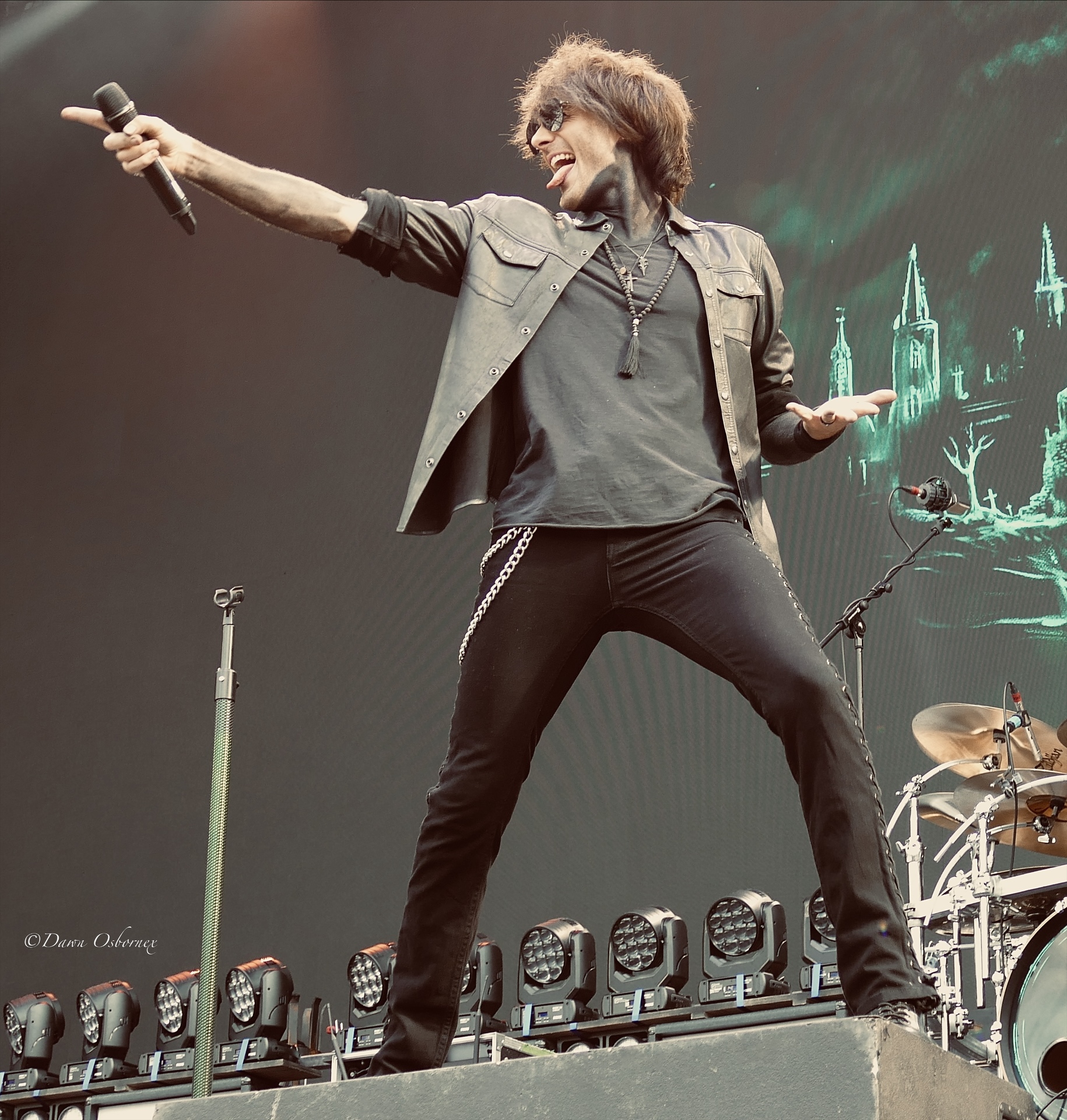 Lzzy Hale came on in a stunning long black cape embellished with cascading gold and silver snakes and a crimson red lining over a cream coloured swimming costume featuring a golden serpent accessorised with shiny pvc thigh length platform boots and long black fingerless gloves as they kicked off with the first track on their new album ‘Fallen Star’. Her voice is in tip top condition blasting out the melody and they easily handle this full stadium of thousands. Arejay’s hard hitting drumming really stands out on every track.
