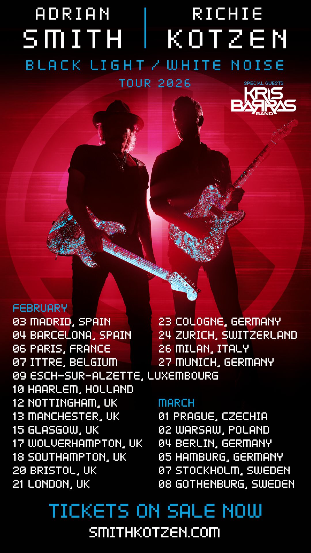 A guitar duo with iconic musical expertise is ready to prove a point once again: Adrian Smith of Iron Maiden and string-instrument icon Richie Kotzen are taking their latest release Black Light / White Noise on tour. The wait is short — it all kicks off in Madrid on February 3rd. Joined by bassist Julia Lage and drummer Bruno Valverde, the second album receives a fresh live presentation.