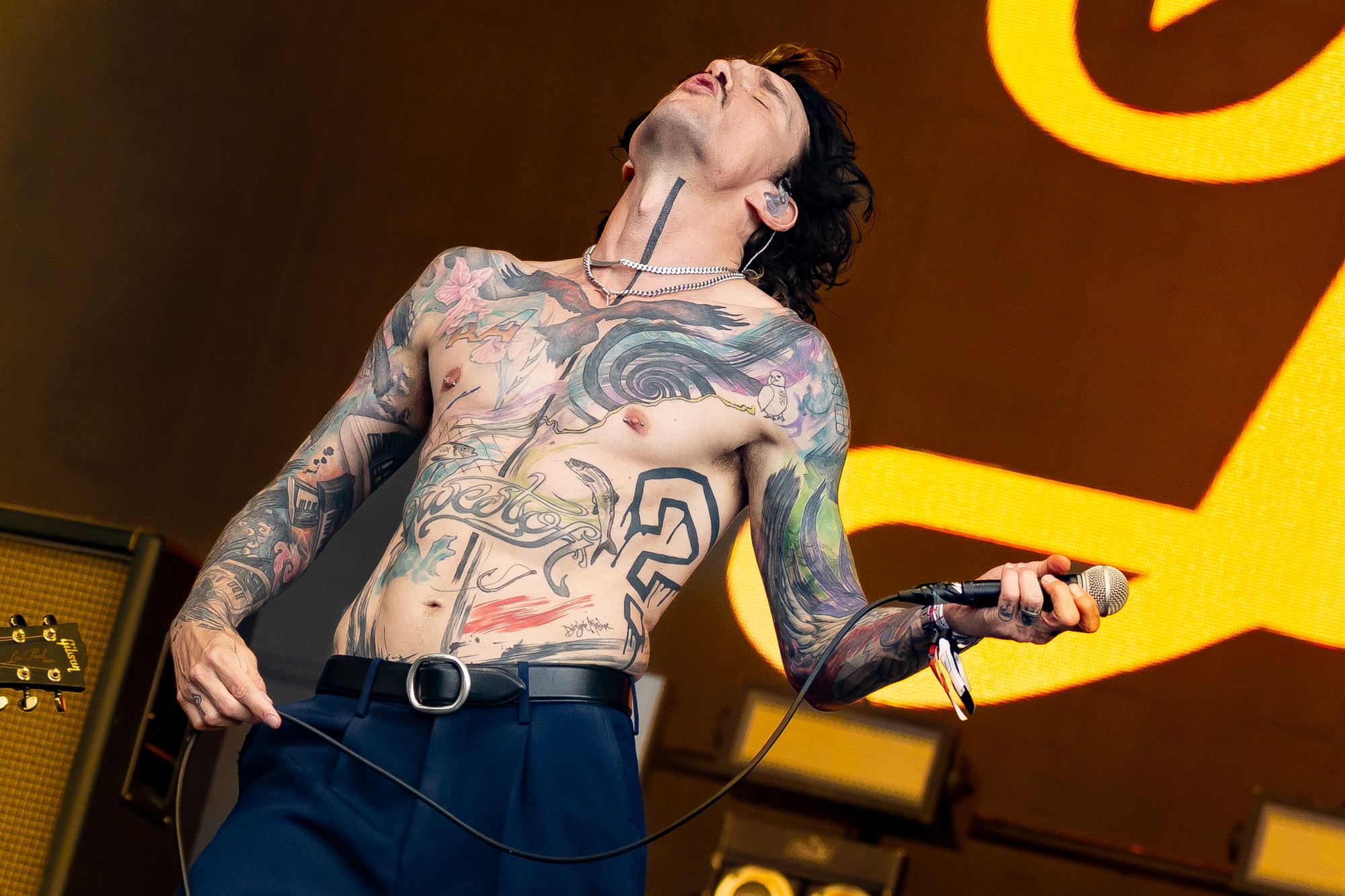 This is so hilariously wonderfully wrong it’s so right at the same time. Sartorially, Justin Hawkins has now got his entire torso covered in tattoos, one of which, right across his stomach reads “Lowestoft”, flipping Lowestoft seriously! The tedious seaside town that he hails from. It couldn’t be any worse unless he’d got Frinton on Sea, or Bognor Regis permanently scrawled on his flesh.