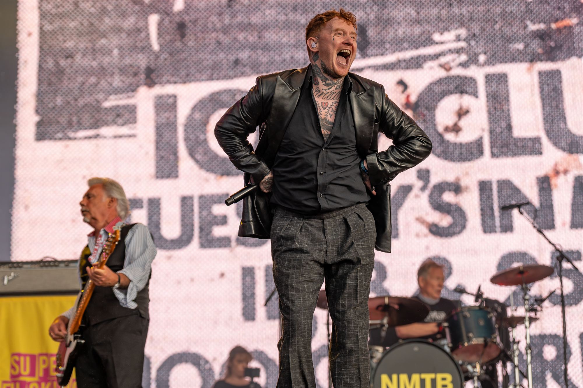 Current bassist Jennie Vee, the widfe of ex Stray Cat Slim JIm Phantom, wins a collective award for best outfit of the festival in the bar afterwards, for a flared PVC catsuit and cowboy hat combination.