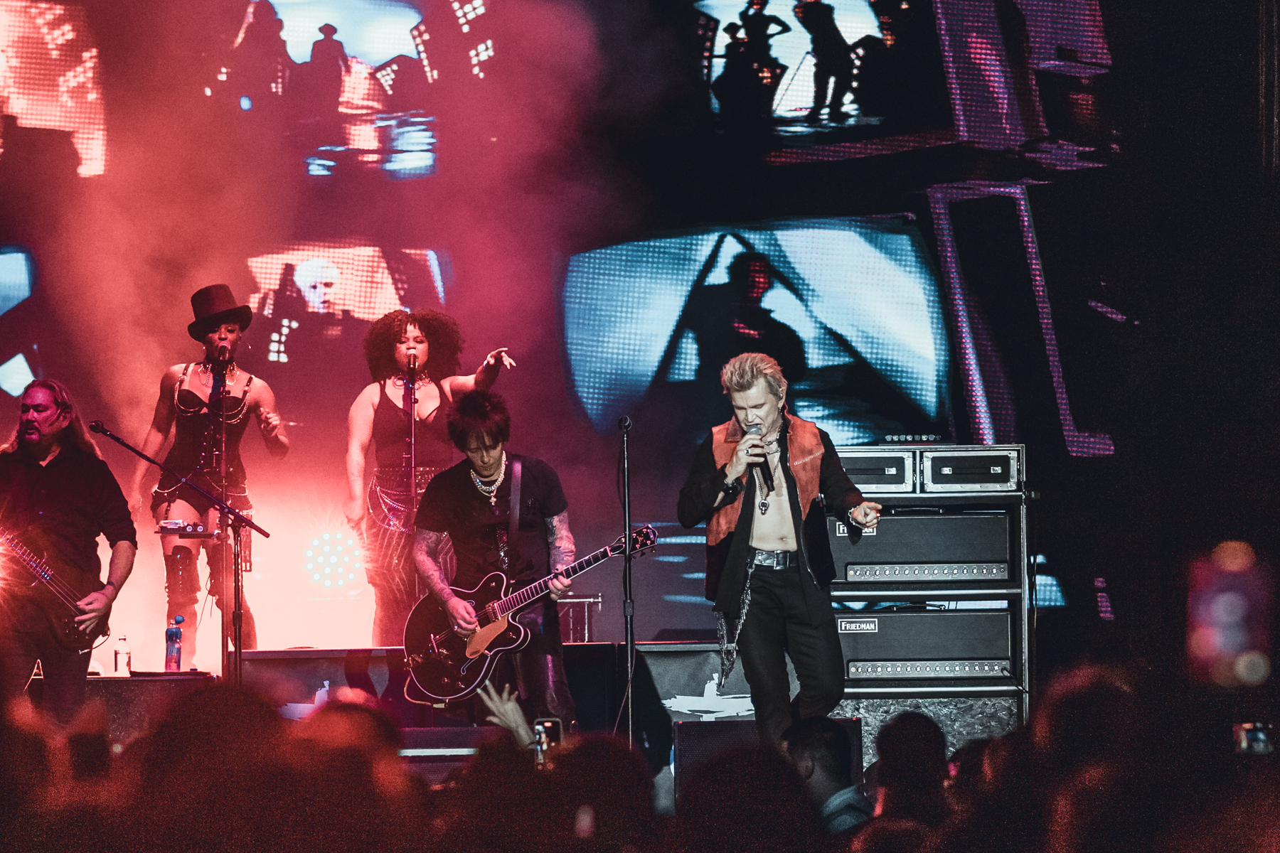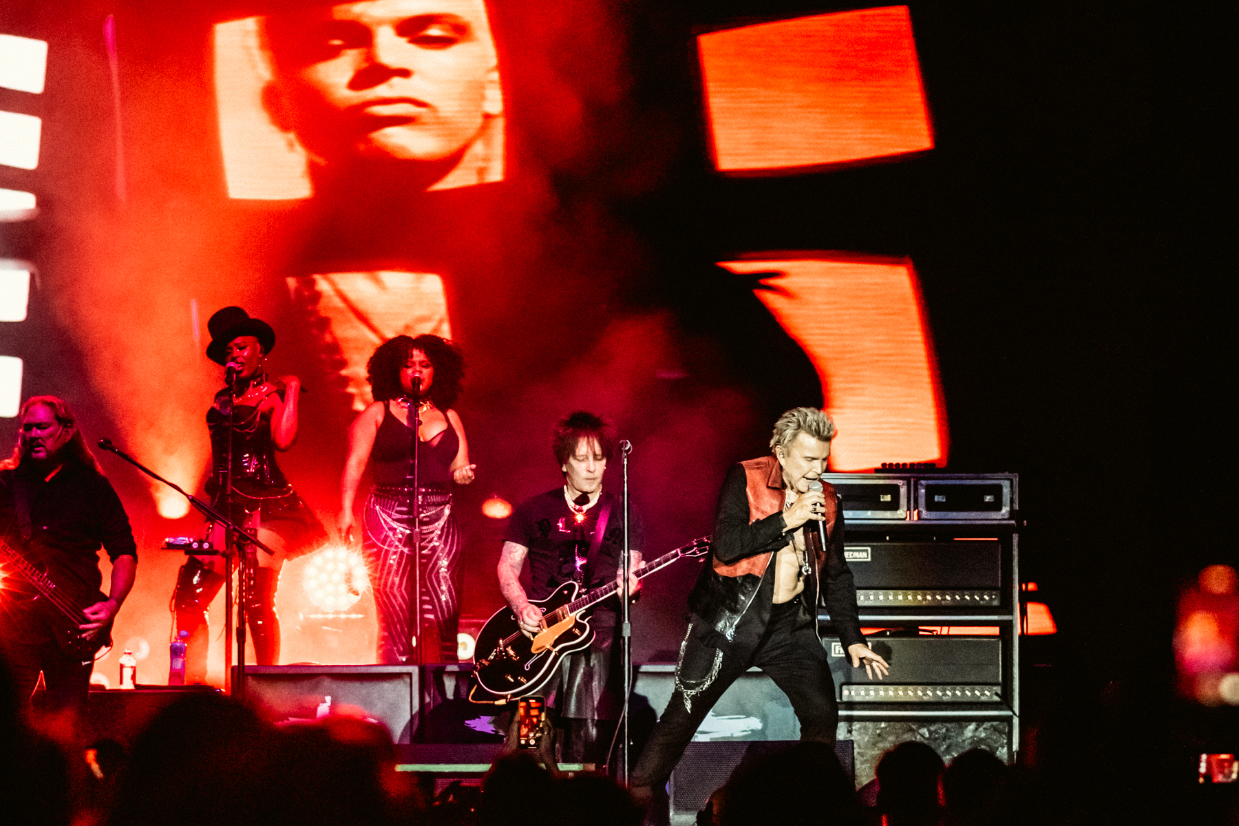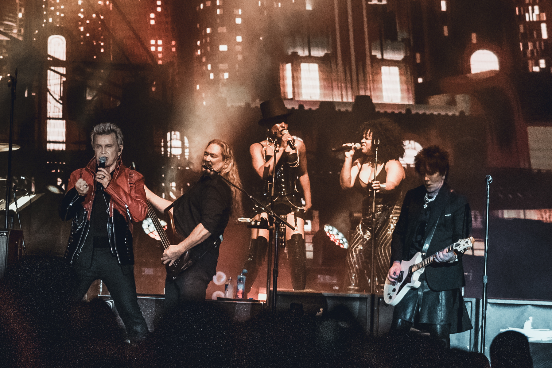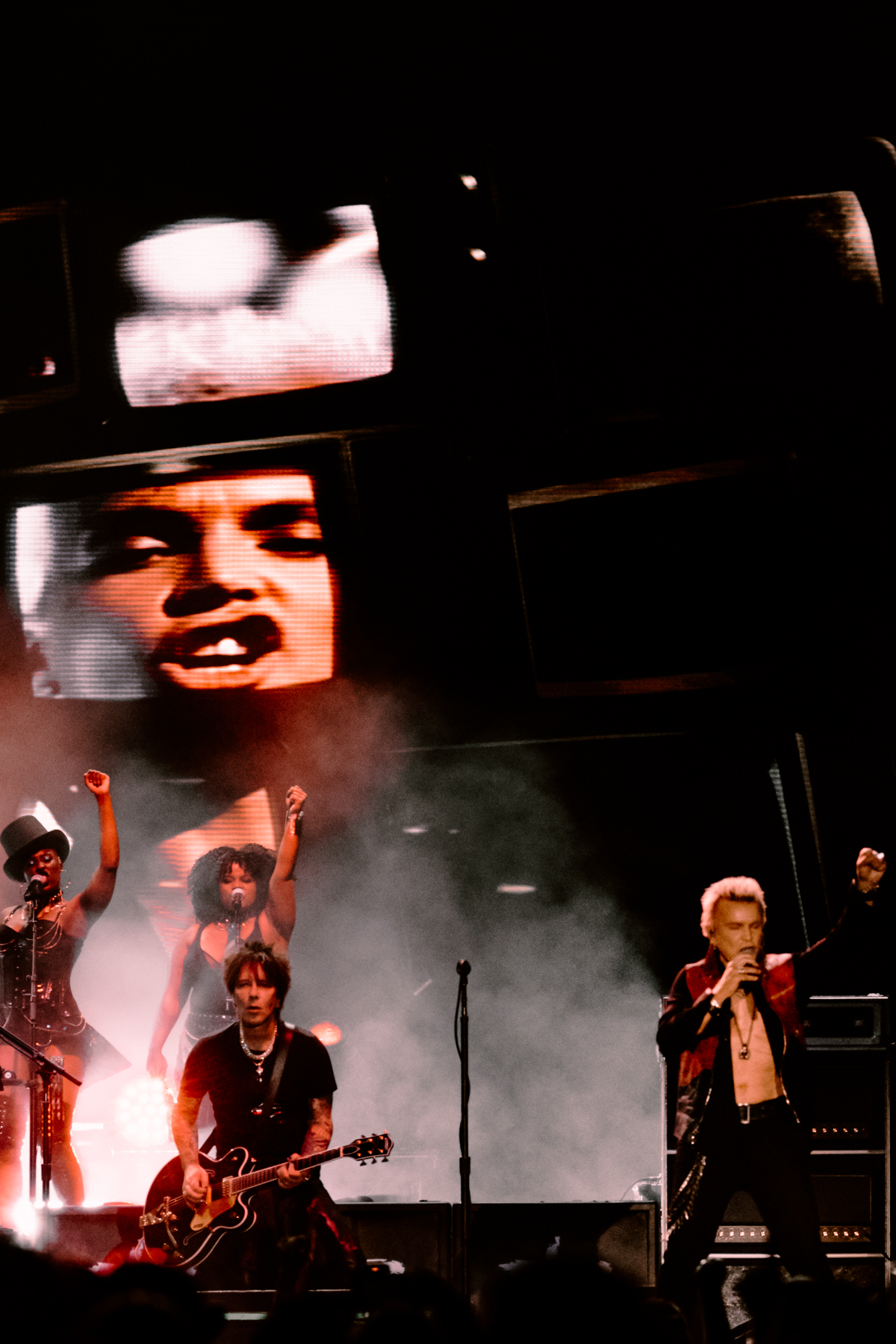 A highlight came with Flesh for Fantasy, as screens behind Idol flashed iconic images from his music video. He teased the crowd, stripping off his shirt, donning his signature leather jacket.