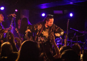 Mongolian folk metallers Uuhai practically bounced onto the stage, at least, as much as the space allowed, to the cheers of a now heaving crowd, ripping straight into their unique blend of classic heavy metal with a Mongolian folk twist. Guitar riffs fused seamlessly with the horsehead fiddles, while throat singing contrasted with clean vocal lines. There’s a pure joy to their stage presence and the crowd lap it up as enthusiastic chants of ‘Uuhai’ ring across the room throughout their set. Band and audience dance together throughout their show and even the introduction of a ballad couldn’t dampen their momentum. There is little doubt Uuhai have a lot more to offer in the future.
