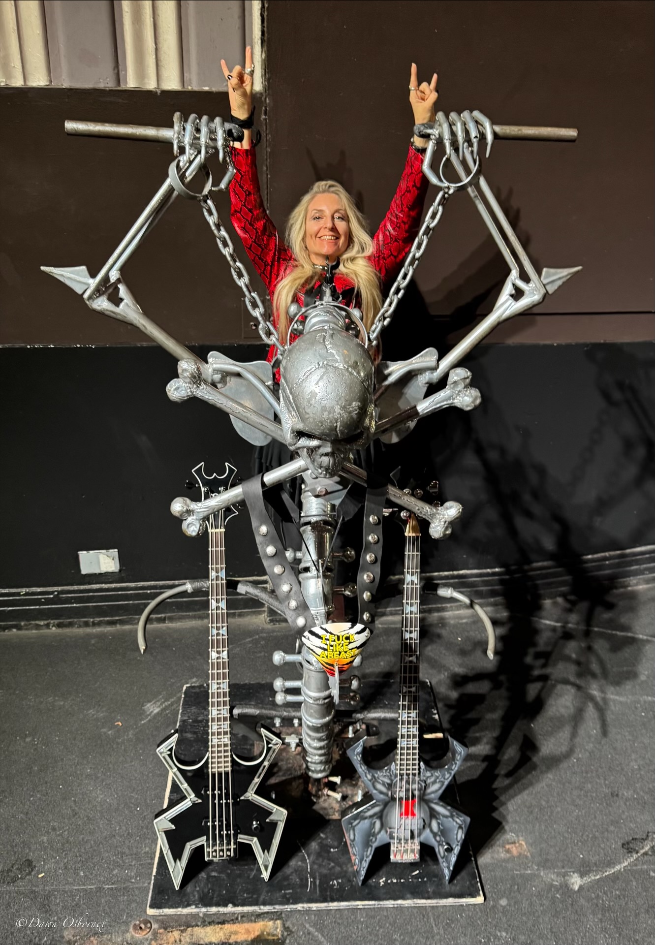 Before the London show Blackie hosted about twenty VIPs for a very special personal experience aimed exclusively at fans. While there was a chance to take a photo with Blackie this was not just a brief hello/snap a photo goodbye event, but was almost two hours full of thrills. Firstly fans were taken into the arena for a photo with ‘Elvis’ Blackie’s huge metal skeletal mike stand set up with two of Blackie’s bass guitars and his ‘Animal’ lyrics codpiece to start them off.